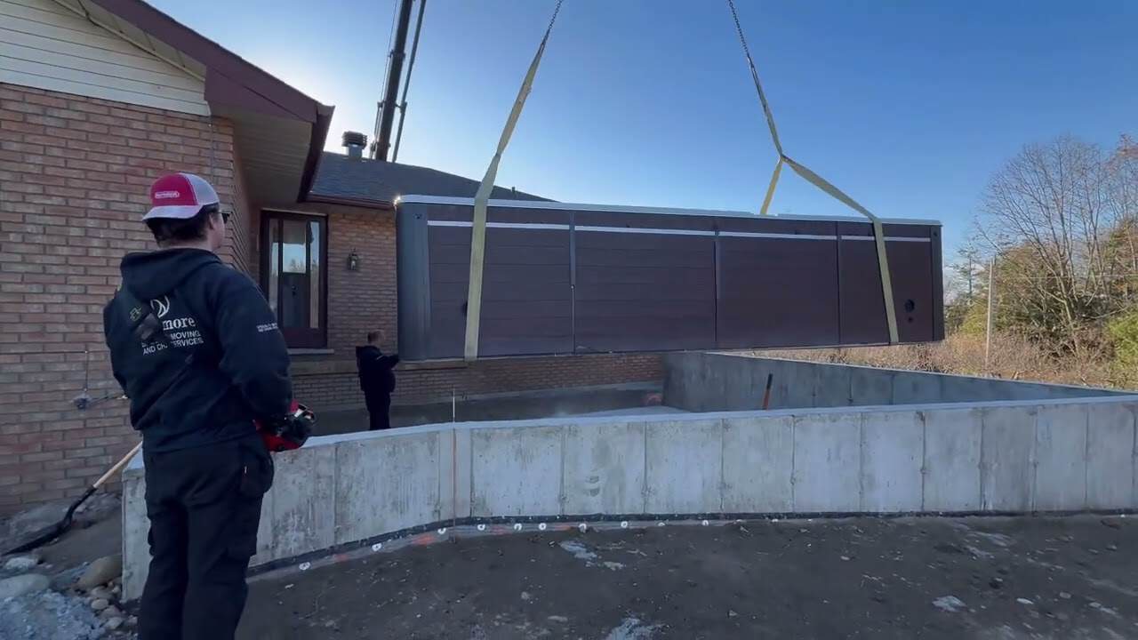 YouTube Video UExKRW45VjRRTGNDSG5MdE5ZZTNSaGxwRjIwWEJncVBxOS41NkI0NEY2RDEwNTU3Q0M2 See Braymore Crane Rental lift a 19‘ Hydropool swim spa over a bungalow in Bradford Ontario .